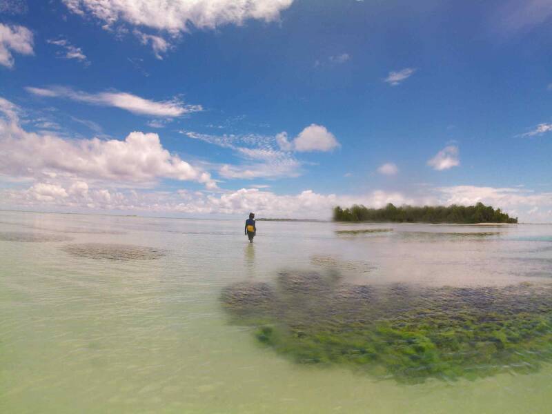 Paramos en varias islas, todas vírgenes, sin humanos ni infraestructuras- No teníamos el dingui inflado, habíamos decidido tirar el ancla fuera de la zona de corales y nadando alcanzábamos la barrera, para luego seguir caminando, en las aguas bajas, hasta llegar a tierra firme- Cada isla en la que nos detuvimos era un mundo en sí- Un mundo, asilado y único , rodeado de Oceano- Un mundo salvaje dentro de otro mundo salvaje- El mundo debajo del agua, con sus estrellas de mar, sus peces y tiburones, mantas gigantes o pequeñas, y el mundo fuera, con sus aves, sus rocas, sus insectos y sus árboles