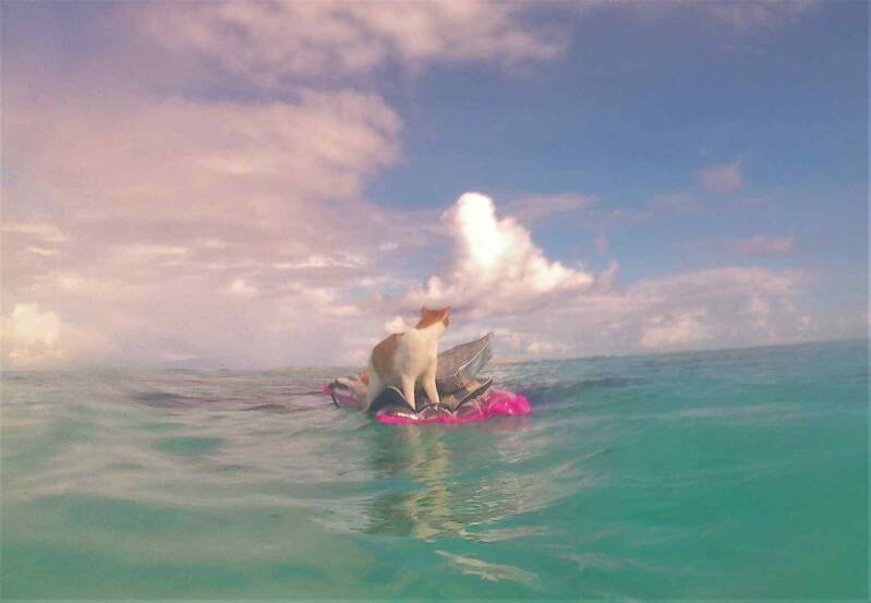 Nos dirigimos luego a una isla más pequeña- Oiuna soñaba con una isla de esas que se ven en los dibujos animados, minúsculas, de arena, para bajar al gato y poder dejarlo libre sin perderlo de vista- Decidimos detenernos entonces en una isla que desaparecía con la marea alta, y solo era un punto de arena cuando la marea bajaba- Ahí, el gato bajó sobre un salvavidas porque seguíamos sin inflar el dingui-