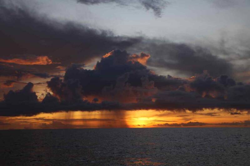 Al salir de Mahe estaba claro que navegaríamos en un cielo sembrado de chubascos- Y también sabíamos que salíamos en la época en que el Sur empezaba a instalarse, sin estar establecido aún- No tenemos internet a bordo, dejar el puerto era dejar toda comunicación y por ende los partes meteorológicos- Pero esa aleatoriedad es parte de la atracción que ejerce el mar sobre nosotros- Y la aleatoriedad de la vida es, de manera general, uno de sus más grandes encantos-