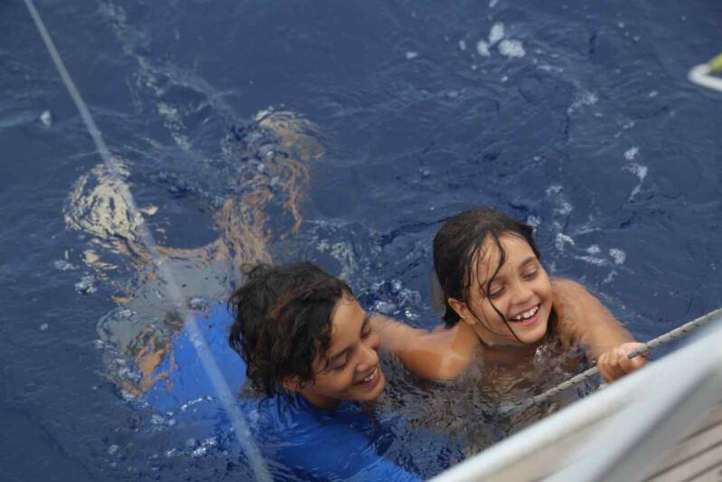 Pero igual el cuerpo termina por marcar la necesidad de descanso y comida, y nadamos hacia el barco, cansadas y hambrientas- Desde la bañera Diego me dice que necesitan más tiempo- Le doy la opción a Oiuna de ir al barco igual, pero ella está sin ganas de ser testigo del espectáculo ya bien conocido de los dos marineros de la casa cortando y vaciando un pez, con la sangre y la escamas por el piso- Regresamos a la playa, a la sombra de una palmera- Oiuna protesta contra los pescadores, pero luego se olvida, y construye un parque de atracción para los cangrejos ermitaños, que no tienen otra que participar-