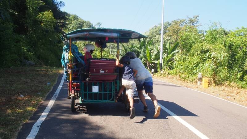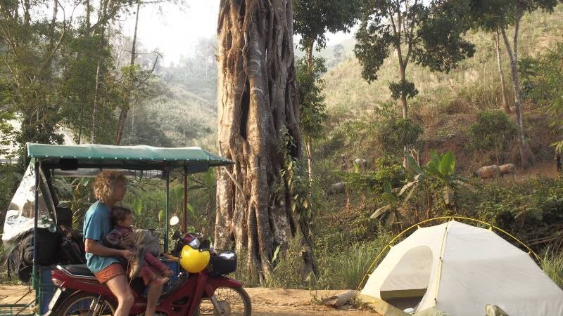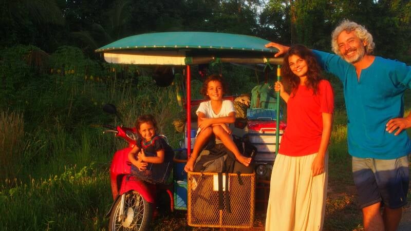 Nous avons quitté la Chine en bus vers le nord de la Thaïlande, et là nous avons retrouvé Gorotea, une petite moto 125cc. Avec l'aide d'un atelier, nous avons construit Chinchero et avec ce chariot, nous sommes partis tous les quatre à l'aventure. En montée, il fallait pousser, mais en descente, elle était géniale !